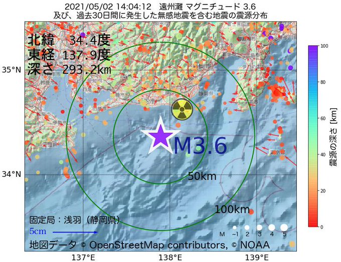 【M3.6】遠州灘 深さ『 293.2 km』 2021/05/02 14:04:12
